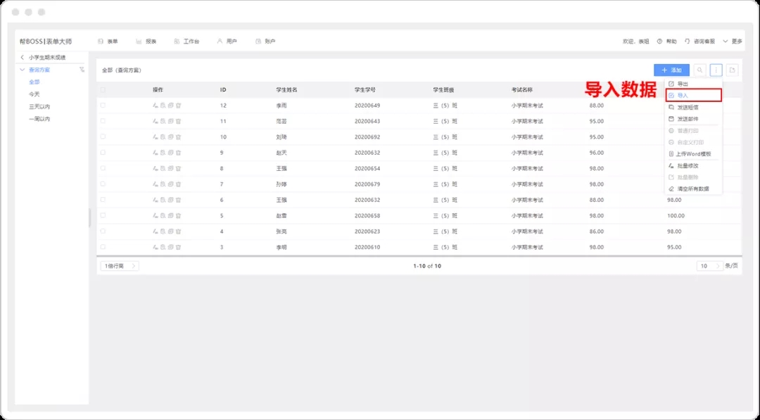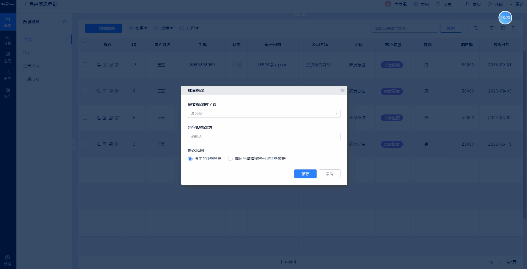 如果表单中添加了手机号或邮件字段,可以针对这些数据进行群发邮件和群发短信。群发前需要创建好邮件模板和短信模板,并通过运营商的审核。