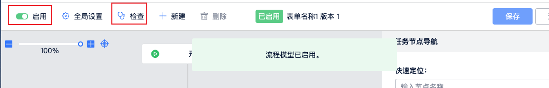 流程结构设置完成后点击“保存”后再点击“检查”,可自动检查设置是否正确并提示。确认无误后点击“启用”,即可启用流程模型。
