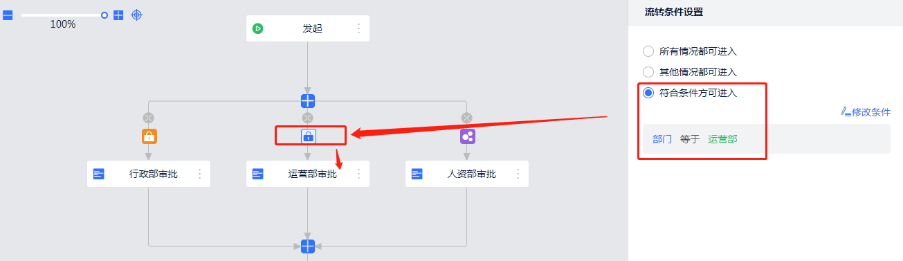 比如常见的请假审批场景,当上一节点数据提交过来后,行政部的申请数据则由行政部负责人审批,运营部申请数据由运营部审批。这时就需要设置流转条件了。